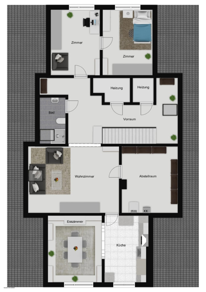 Im DG: Wohnraum, Küche, Essbereich, zwei Zimmer und Bad mit WC.
