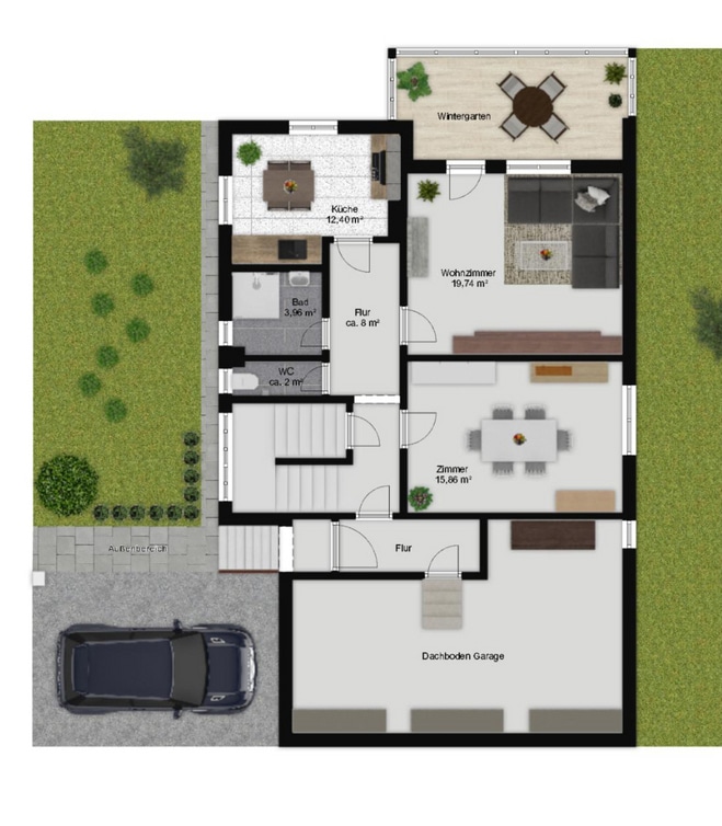 Das Haus bietet eine durchdachte Aufteilung auf zwei Ebenen. Im Erdgeschoss spielt sich der Alltag ab – mit Wohnbereich, Küche und direktem Zugang zum Wintergarten. Dieser lässt sich durch aufschiebbare Elemente flexibel öffnen und wird so zum erweiterten Wohnbereich.