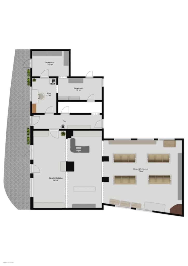 • Bestehendes Mobiliar kann genutzt werden: Kühlregal, Brotregal, Feinkosttheke, Verkaufsregale, Büromöbel