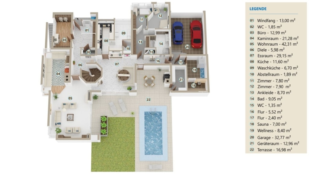 • Die prachtvolle Terrasse von ca. 25 m², ein stilvoller Pavillon und der einladende Pool machen den Außenbereich zu einem privaten Paradies.