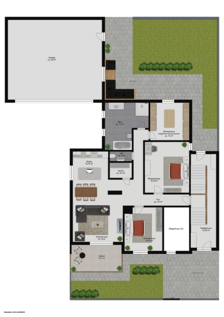 Essbereich Wohnzimmer Wohnzimmer Balkon Bad Bad WC Schlafzimmer Schlafzimmer Kinderzimmer Flur Garderobe Stiegenhaus Terrasse Garten Außenansicht Garage Garage -HOMEPAGE_Rundgang