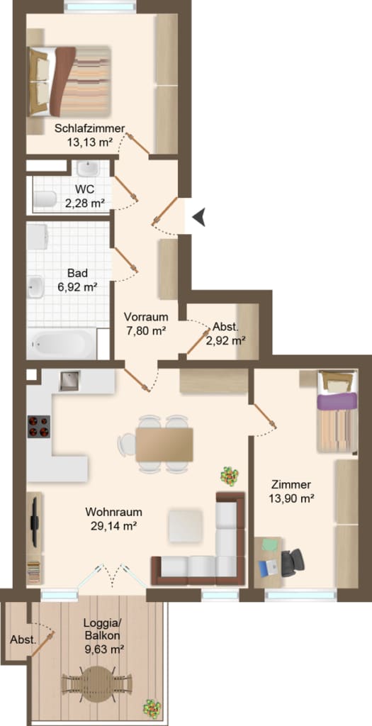 Die durchdachte Raumaufteilung mit zwei Schlafzimmern macht die Wohnung ideal für Paare, kleine Familien oder Wohnen mit Homeoffice.
